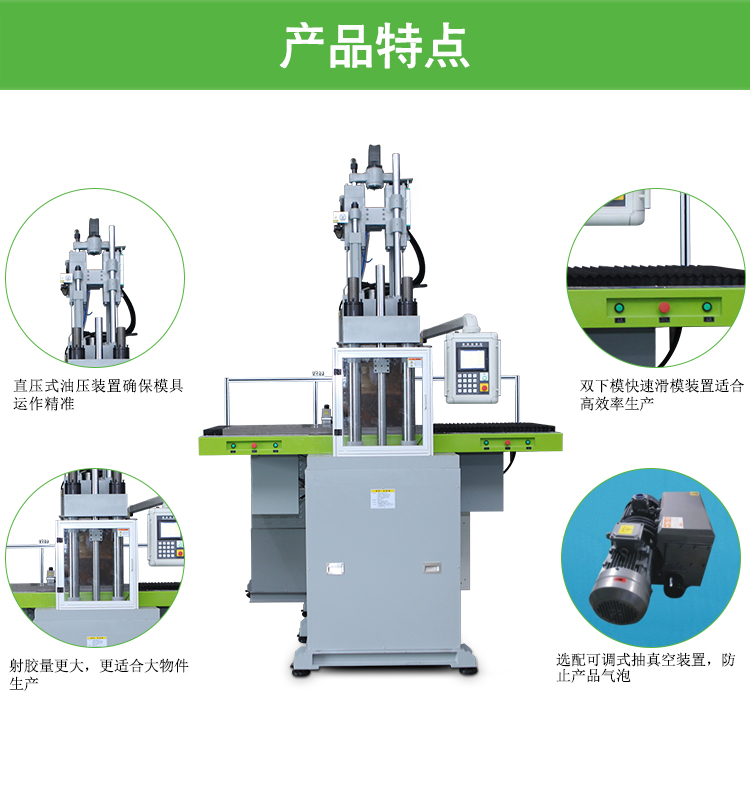 直壓式液壓裝制確保安全生產機床管理招商精準,  雙下模組速滑模裝置設備符合高效化率種植,  射膠量大,更適當大東西產出,  配置可手動調節式抽真空度部件,可以防止從裂痕。